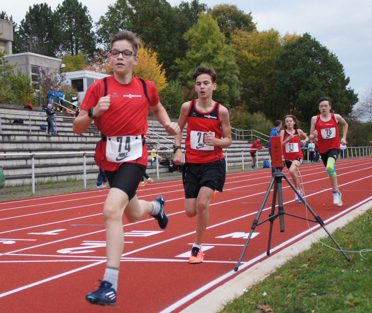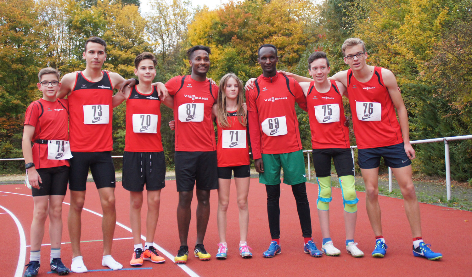 Nach 2 1/2 St war das Stadion mit der taufrischen neuen Tartanbahn erreicht. Ein Stadion an einem Abhang gelegen und umgeben von einem herrlichen Baumbestand und zu unserer Überraschung-absolut windstill. Hinzu kamen Temperaturen um 13 °C und vervollständigten die absolut besten Bedingungen. Glück muß man haben!