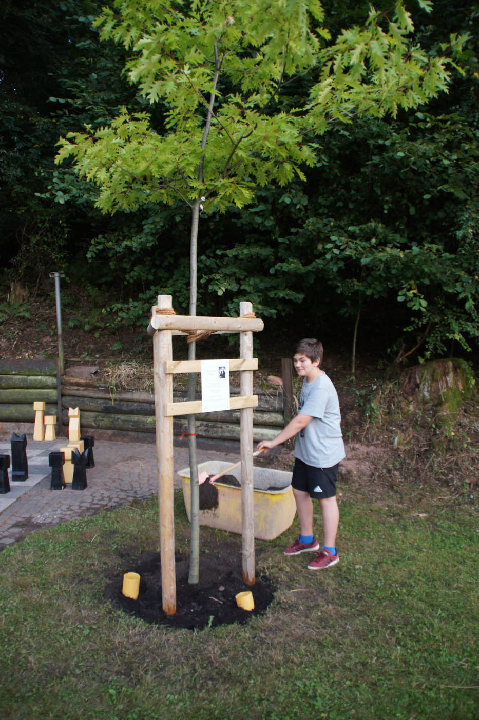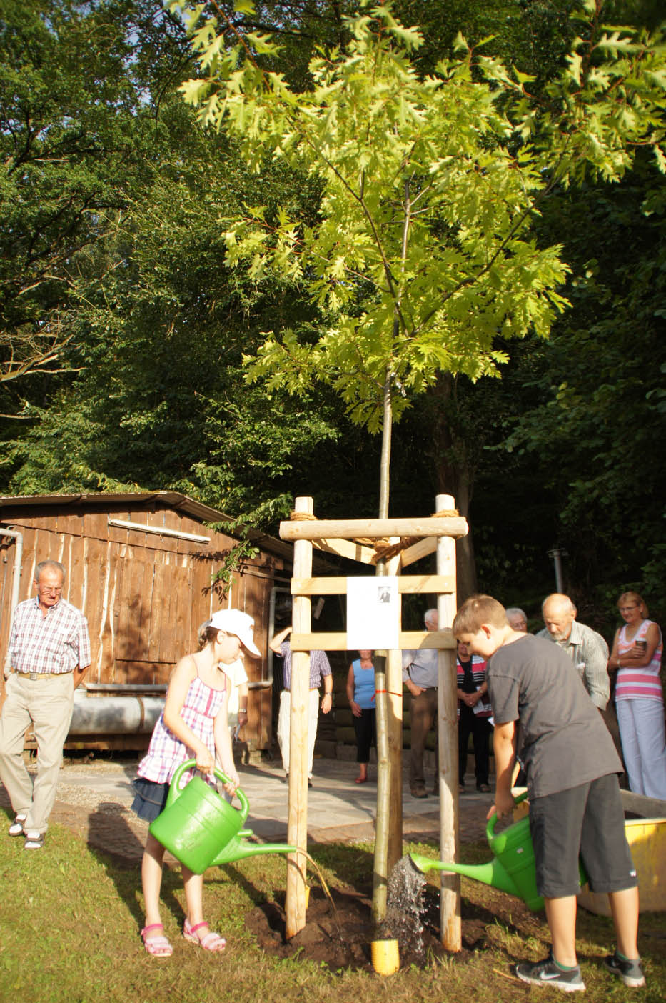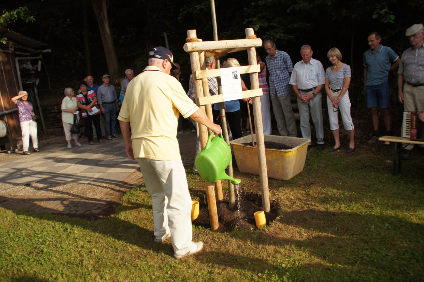 Anschließend ließen es sich die anwesenden Weggefährten von Karl nicht nehmen, einen Beitrag zum Setzen des Denkmals ihres Angehörigen oder Freundes Karl Junk zu leisten und versorgten die Eiche ebenfalls mit Erde oder Wasser, der eine oder andere auch mit einem Abschiedsgruß. Enkel Lukas Junk bekam einen kleinen Ableger der Karl-Junk-Eiche. Eine bewegende und feierliche Gedenkstunde.