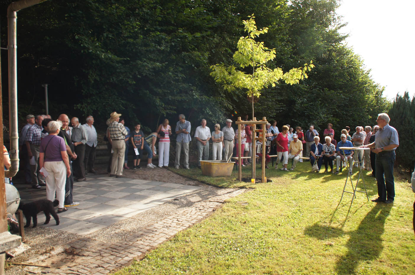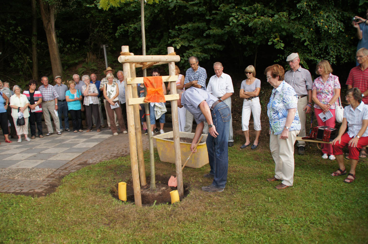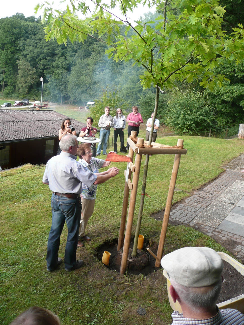 Im Anschluss an das Begehen des Jahneichen-Jubiläums zog die Versammlung in einem langen Tross zum Vereinsgelände des TV, wo auf der oberen Terrasse Karls Eiche auf ihre endgültige Pflanzung wartete.
