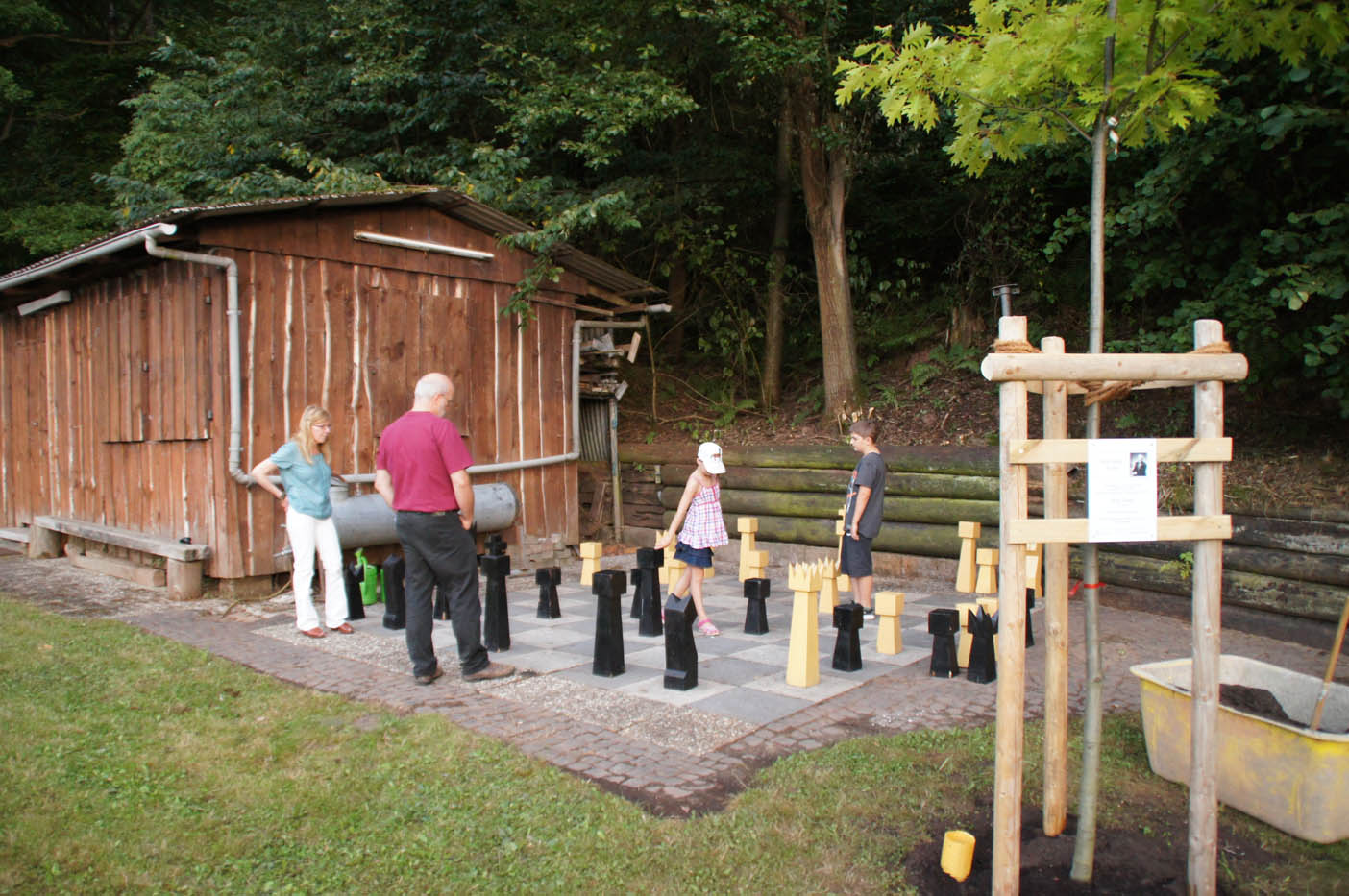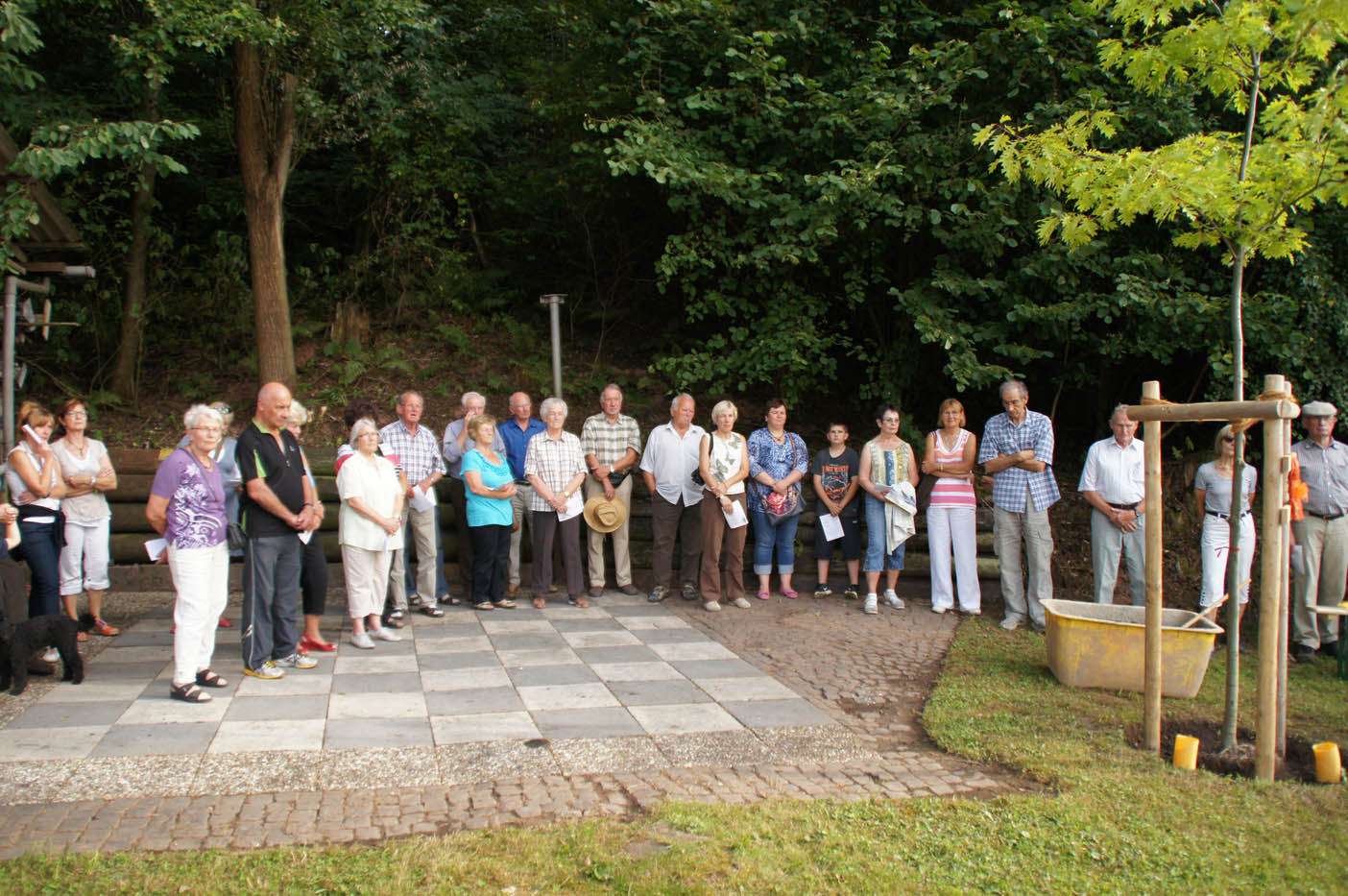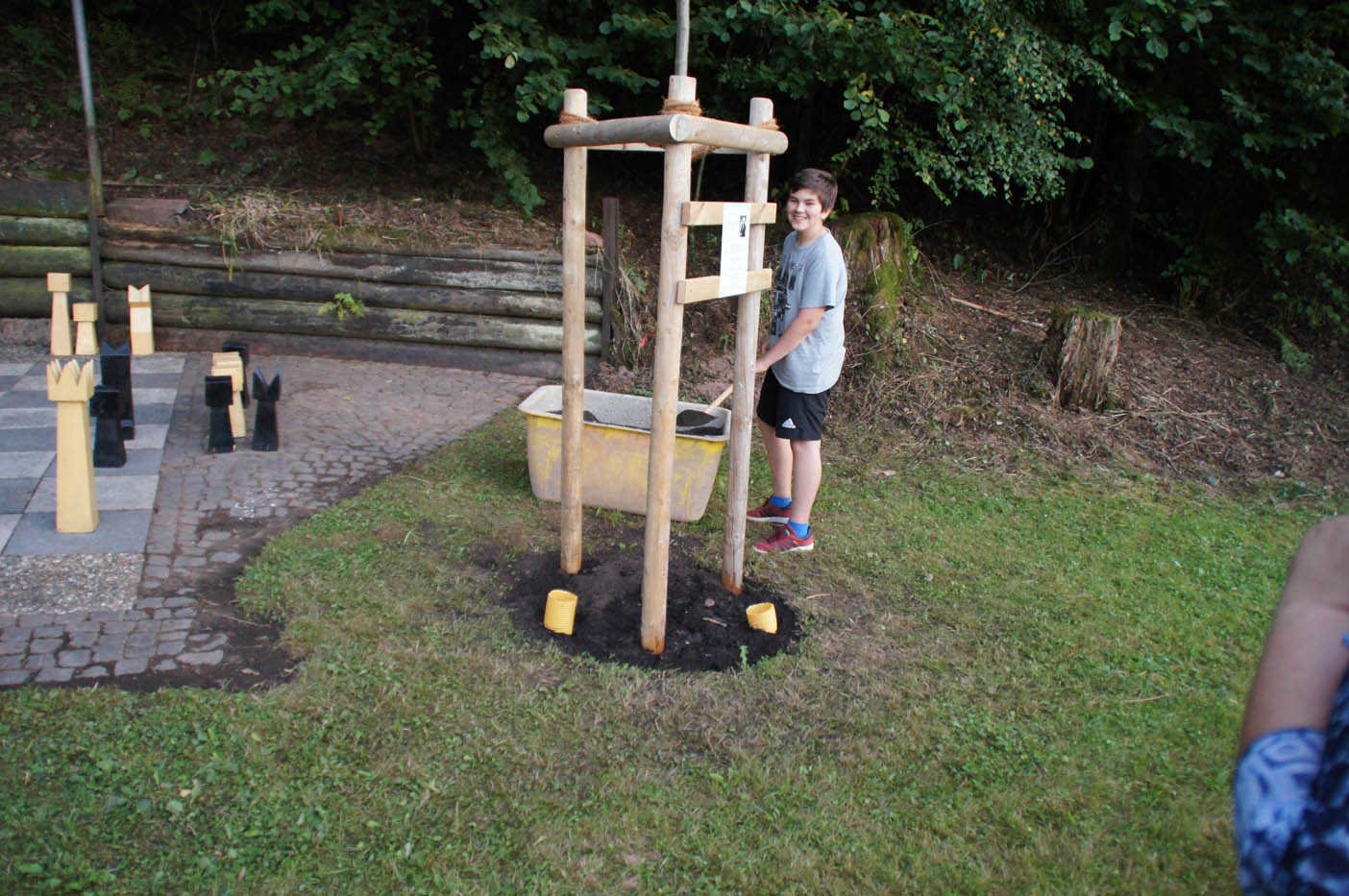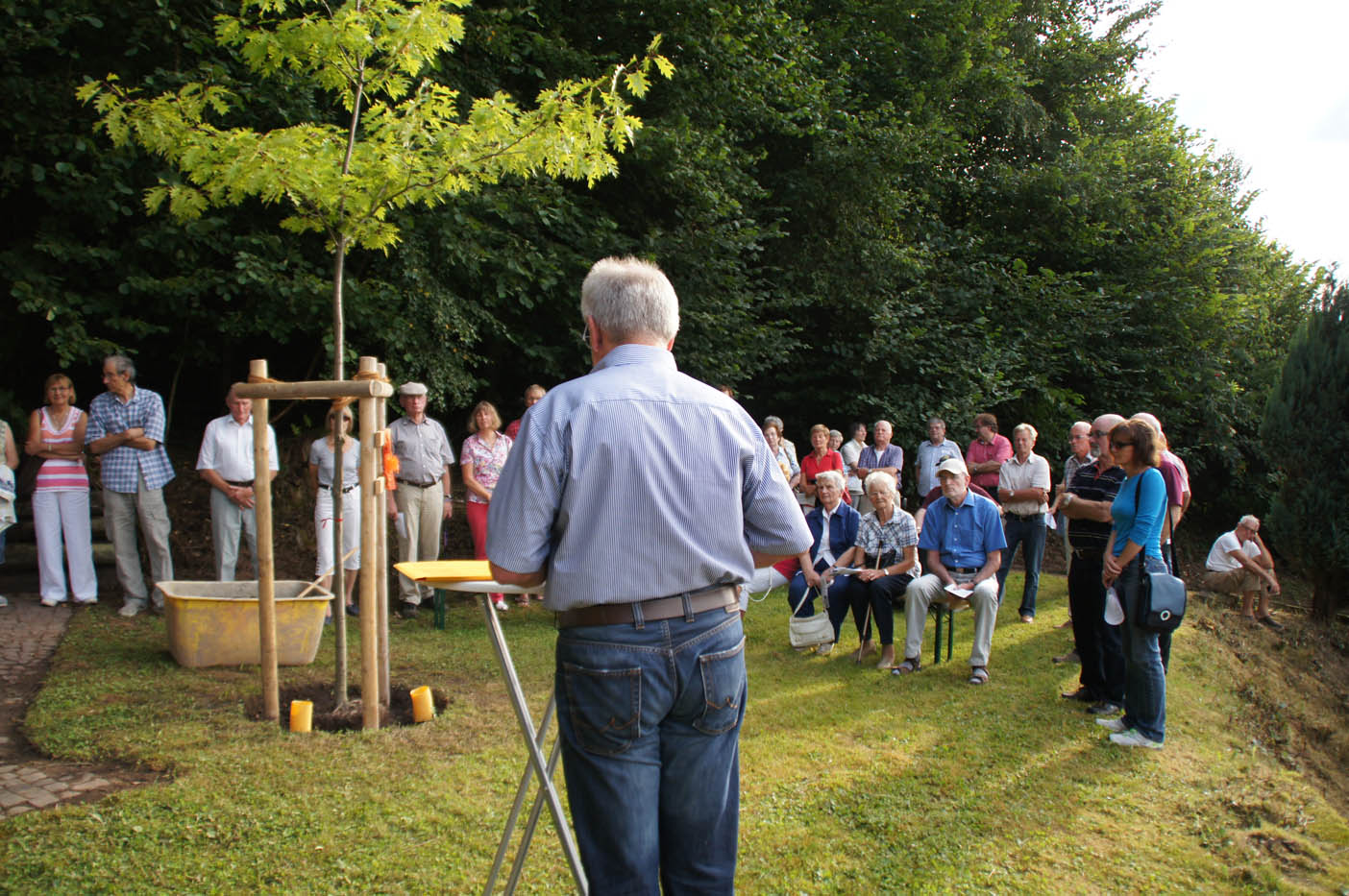 Im Anschluss an das Begehen des Jahneichen-Jubiläums zog die Versammlung in einem langen Tross zum Vereinsgelände des TV, wo auf der oberen Terrasse Karls Eiche auf ihre endgültige Pflanzung wartete.