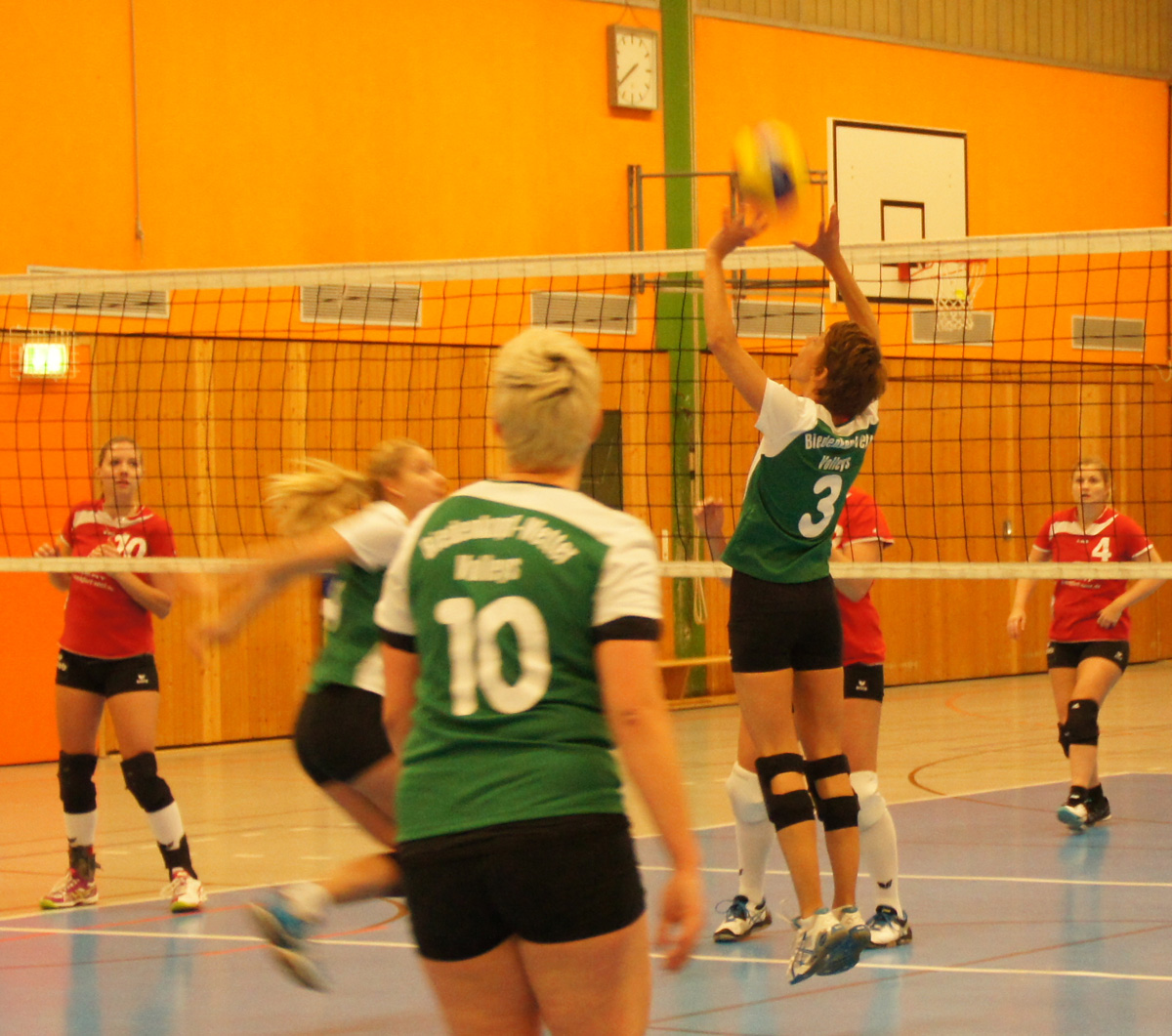 Doch wer auf Seiten der Gastgeber nun glaubte, diesmal könnte es für einen Sieg reichen, sah sich bald getäuscht. Langsam warm gespielt zeigten sich die Karbenerinnen in Satz zwei von ihrer besseren Seite und fanden über den Kampf ins Spiel. Jetzt stand es schnell 5:0 für sie. Aber die Biedenkopf Wetter Volleys ließen sich nicht abschütteln, sondern kamen wieder heran und schafften schließlich bei 12:12 den Ausgleich. Danach wogte das Spiel hin und her und gewann zunehmend an Klasse. Nach einem spektakulären Ballwechsel gingen die Gastgeberinnen erstmals in Führung: 18:17. Sollte das der Endspurt zum zweiten Satzgewinn werden? Er war es nicht. Auf Karbener Seite hieß es noch einmal „Volle Konzentration!“ und das langte, um den Satz mit 25:21 nach Hause zu bringen.