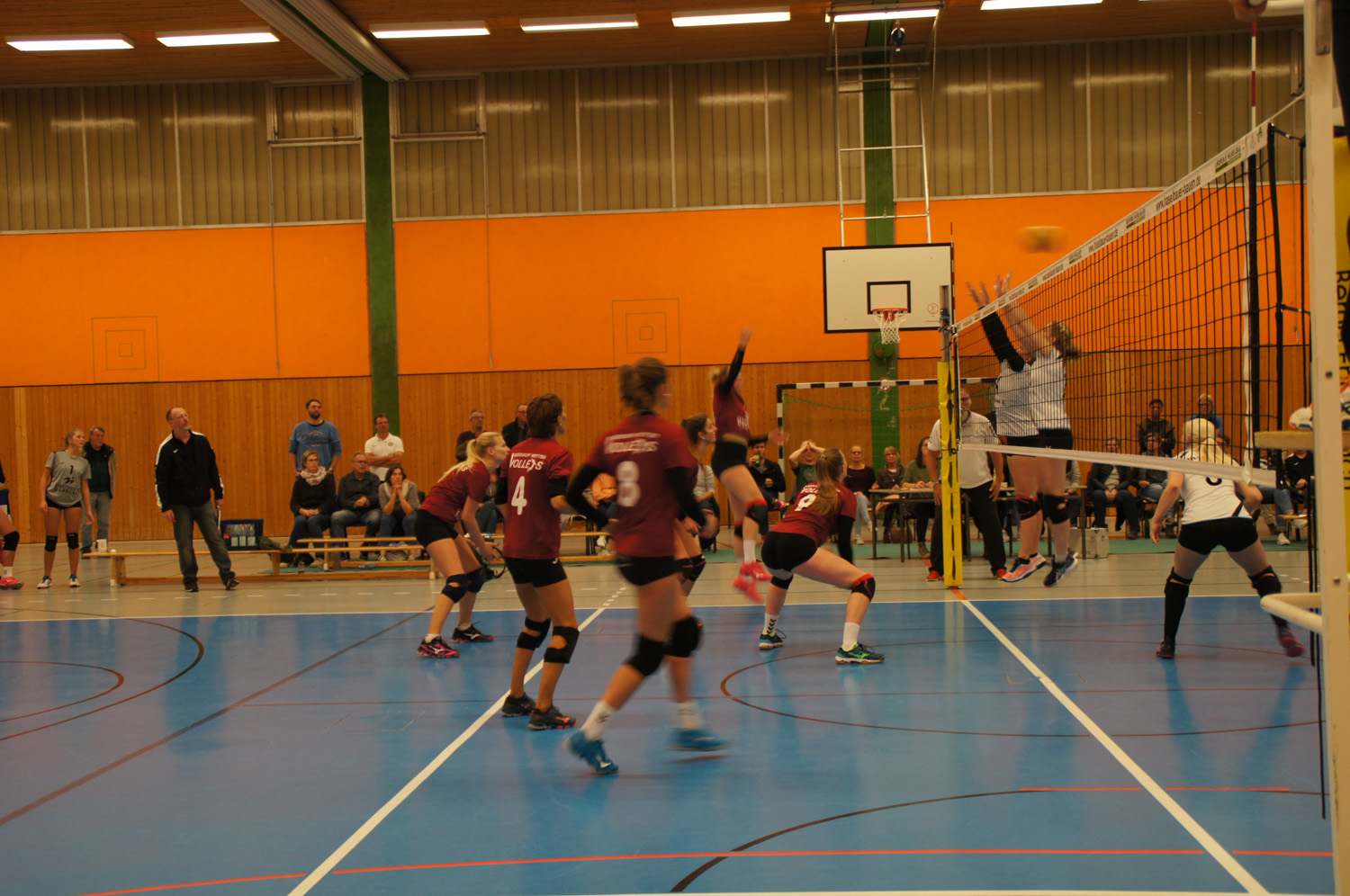 Nun lief es deutlich besser für das Heimteam. Die Annahme hielt. Leonie Sauerwald punktete erfolgreich mit ihren starken Angriffen im Rücken des Zuspielers und Lilli Kreutz sorgte mit starken Aufschlägen für die nötigen Breaks, um sich bis auf 19:13 abzusetzen. Auch die Einwechselung von Emma Bögel brachte im Block gleich Zählbares. Als es gerade richtig rund lief, brachte ein vermeidbarer Ballverlust durch unentschlossenes Handeln in der Feldabwehr gleich wieder Sand ins Getriebe. Eigenfehler auf Seiten der Volleys ließen die Bad Homburger vorbeiziehen und den Satz mit 25:23 gewinnen.