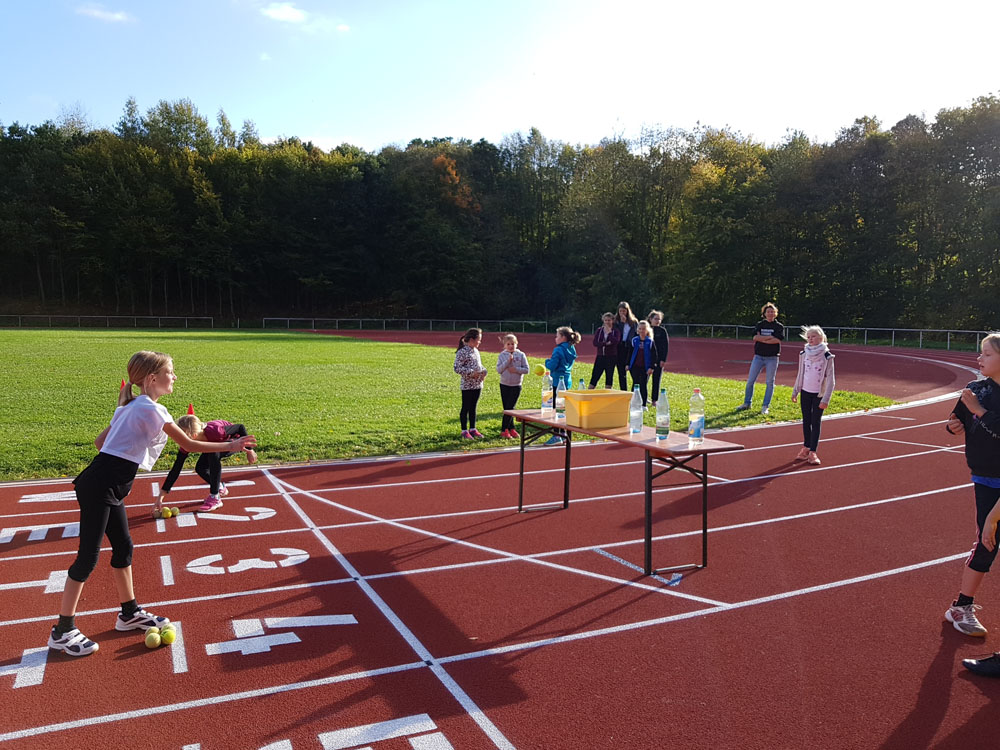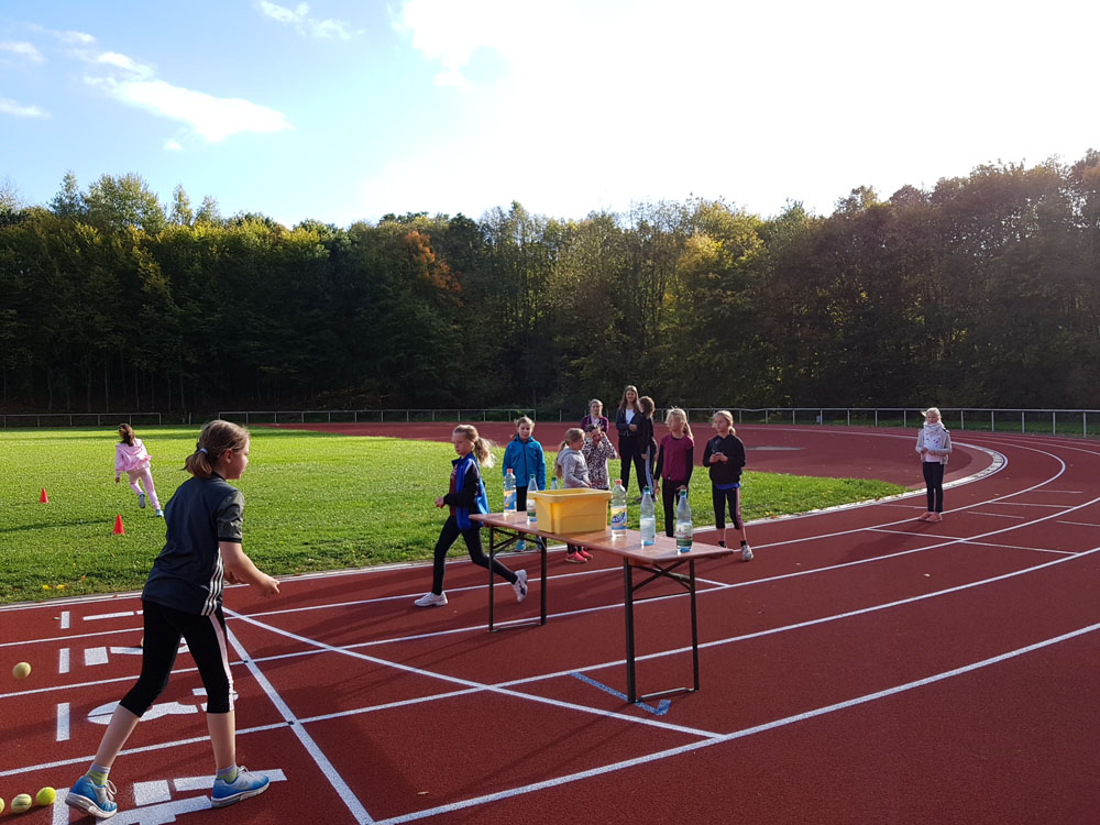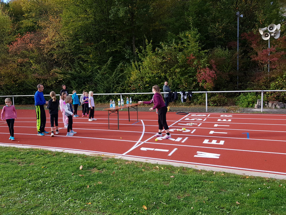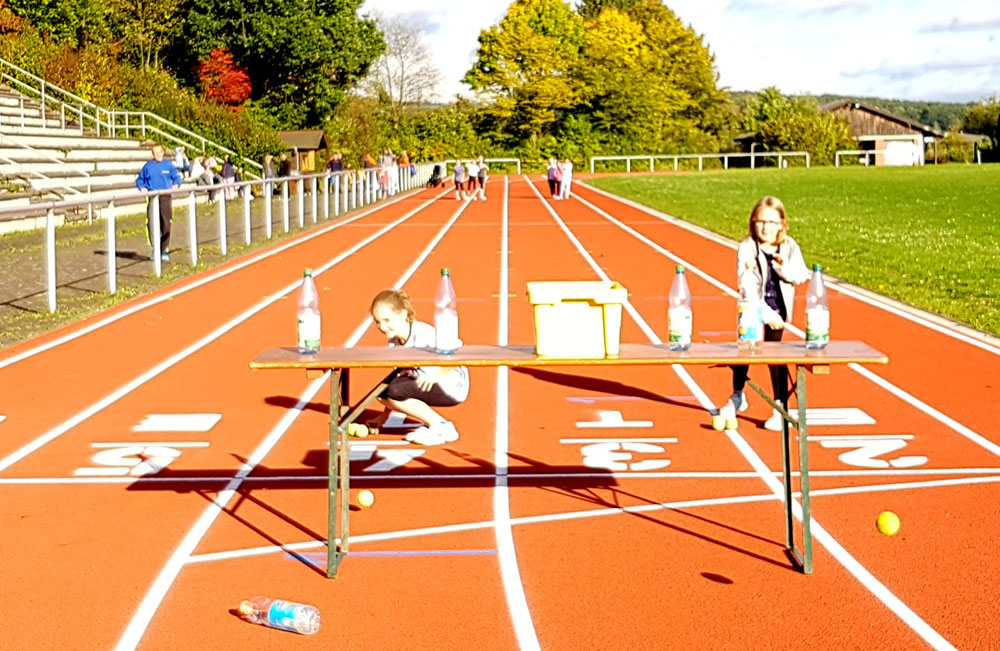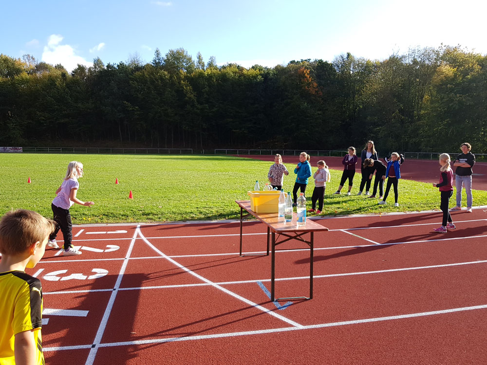Mit 20 Jugendlichen aus der Jugendturn-Gruppe von Andrea Müller und aus der Jugend-Leichtathletik-Gruppe von Anna-Lena Wellner startete das vereinsinterne Lauffest mit einer Biathlon-Staffel. Hier mussten 4er-Teams eine Laufstrecke absolvieren und am Ende Flaschen von einem Tisch werfen. Für jede Flasche, die stehenblieb, musste man eine kleine Strafrunde laufen.