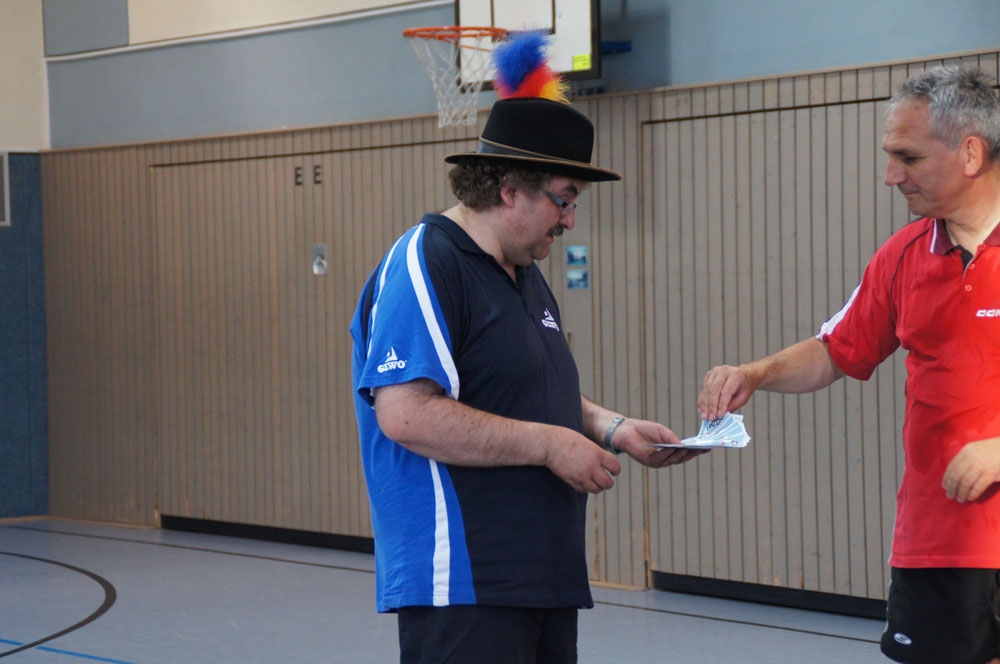 Zu Beginn loste Gerhard Zissel die Gruppen aus - selbstverständlich auf Grenzegangs-Auslos-Zetteln. Dann ging es an die Schlägerverteilung. Während einige Schläger, wie z. B. der Wettersche, ähnliche Maße hatten wie ein normaler Schläger, gab es aber auch den riesigen und unhandlichen Schläger aus Biedenkopf sowie den schmalen aus Goßfelden oder den verzerrten aus Wollmer. Aber ein guter Spieler kommt ja mit jedem Material zurecht...