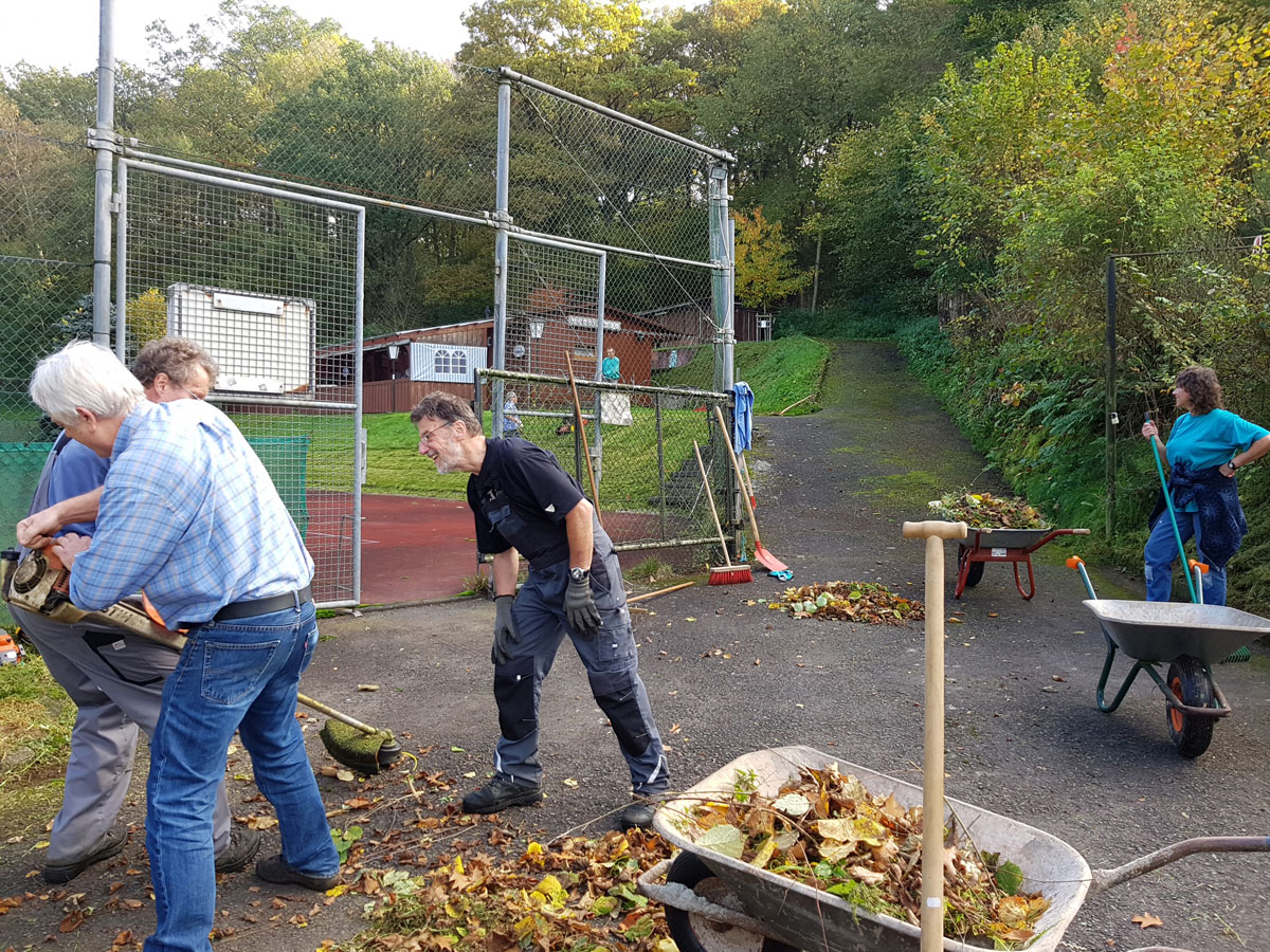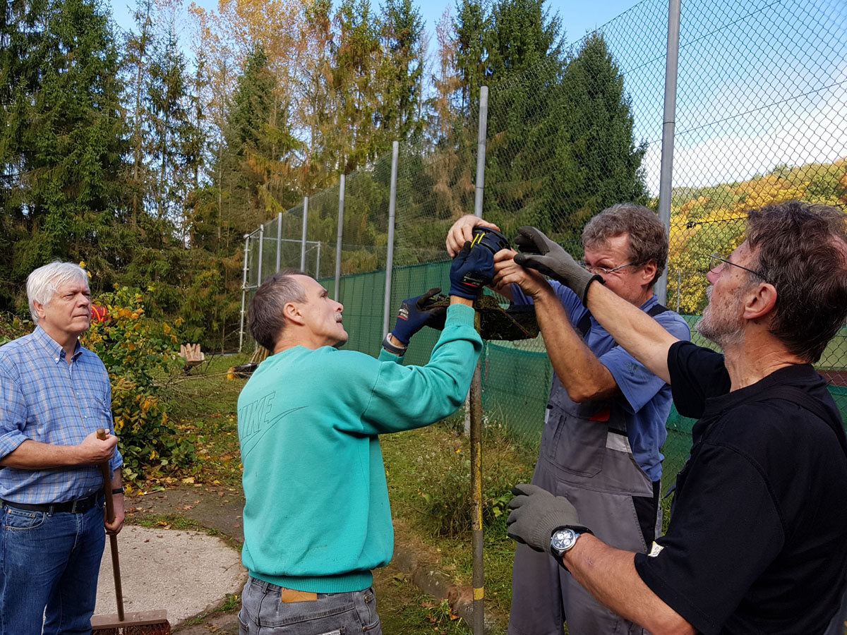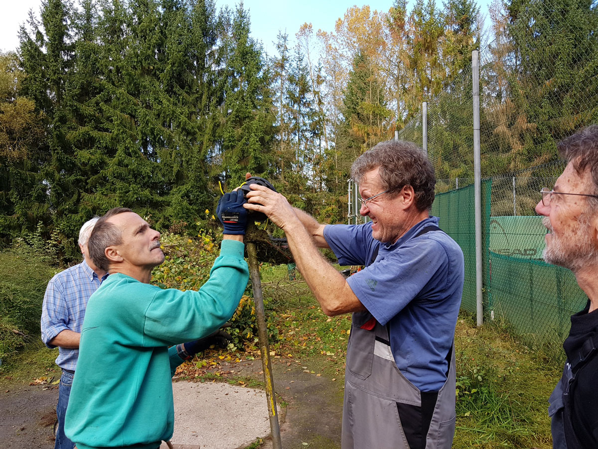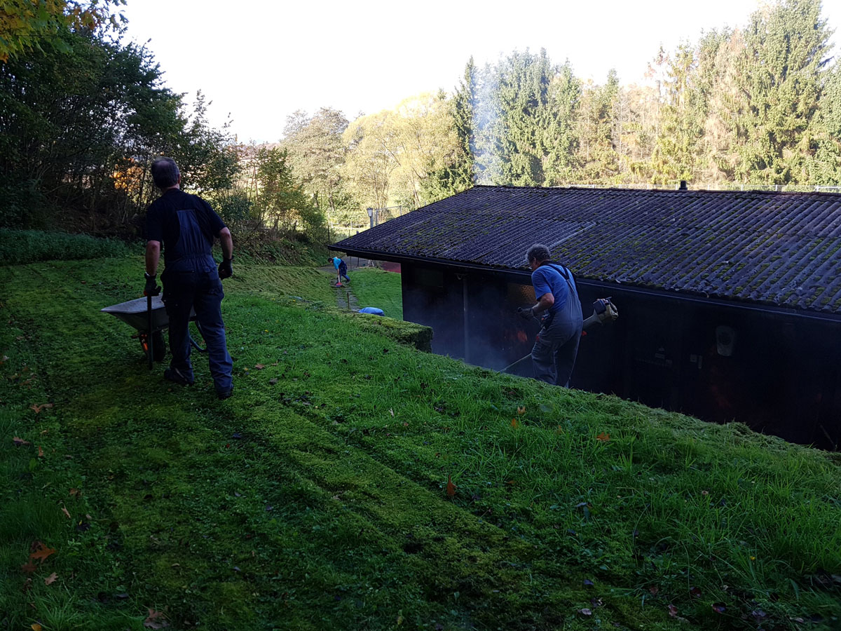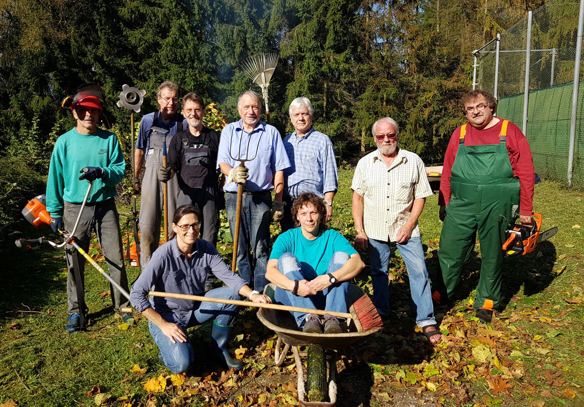 Der Arbeitstrupp nach dem Mähen, Rechen, Hacken, Schneiden, Kehren, Schippen, Abfahren und Abbrennen des Überwuchses rund ums Vereinsheim des TV. |