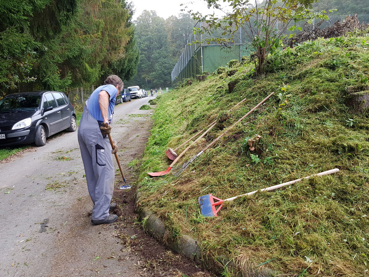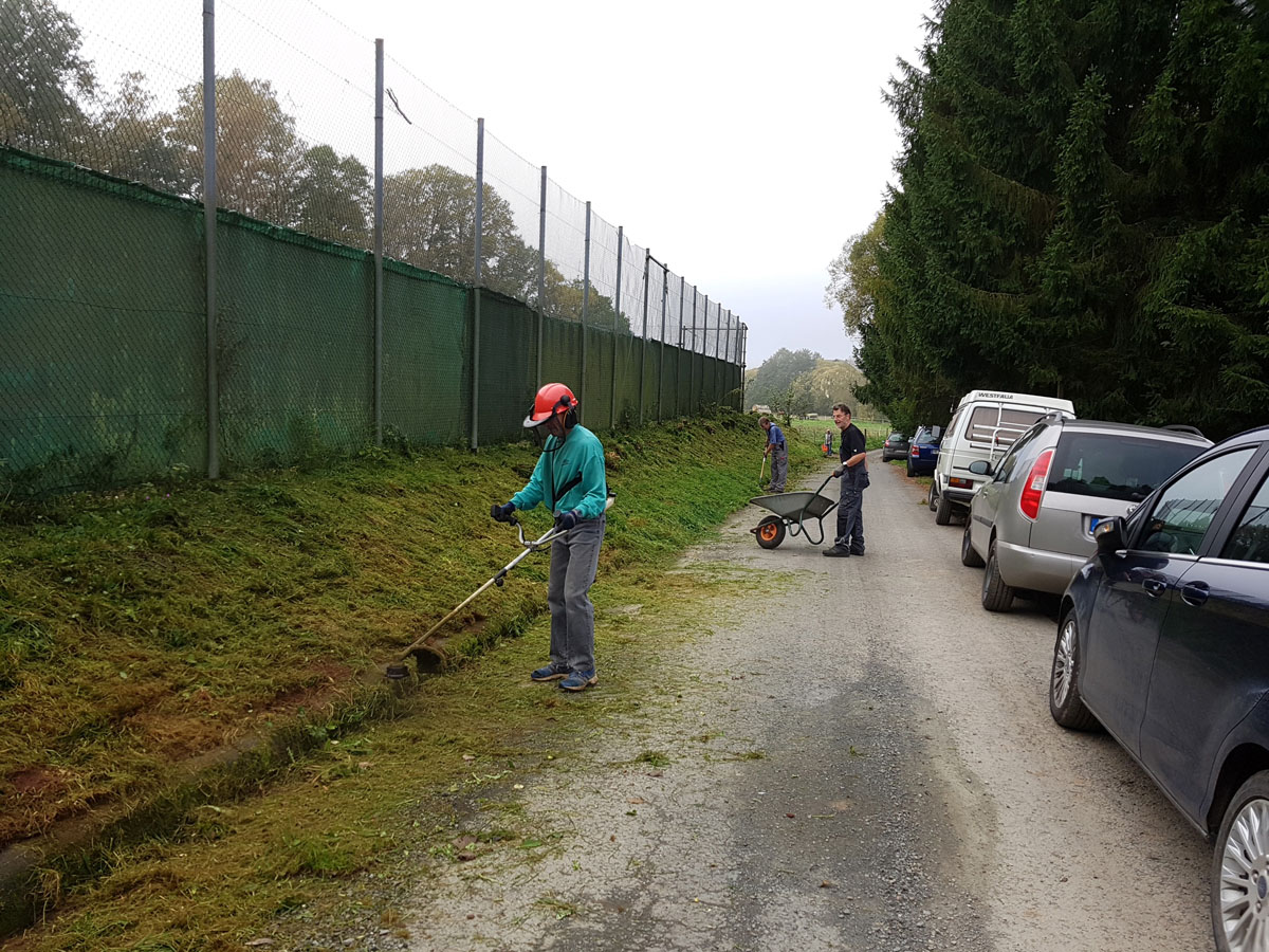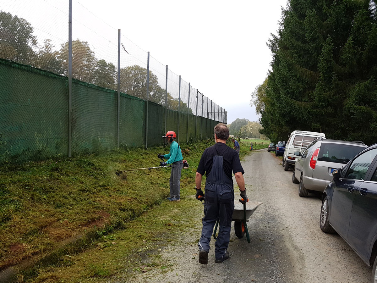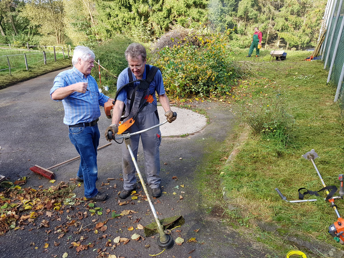 Der Arbeitstrupp nach dem Mähen, Rechen, Hacken, Schneiden, Kehren, Schippen, Abfahren und Abbrennen des Überwuchses rund ums Vereinsheim des TV. |